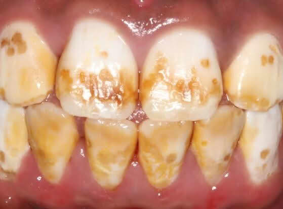 “Ved inntak av for mye fluorid under tanndannelsen kan emaljen bli feil oppbygd. Dette fører til misfarginger, og i de alvorligste tilfellene avskalling og feildannet tannemalje.”